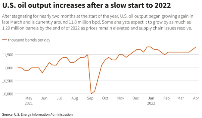 На призывы о новых поставках нефти отвечает все больше производителей, поскольку цены в США остаются выше 100 долларов за баррель, чему способствует СВО России в Украине. Цены выросли на 70% по сравнению с прошлым годом, компенсируя опасения по поводу второго падения цен из-за пандемии и инфляции.