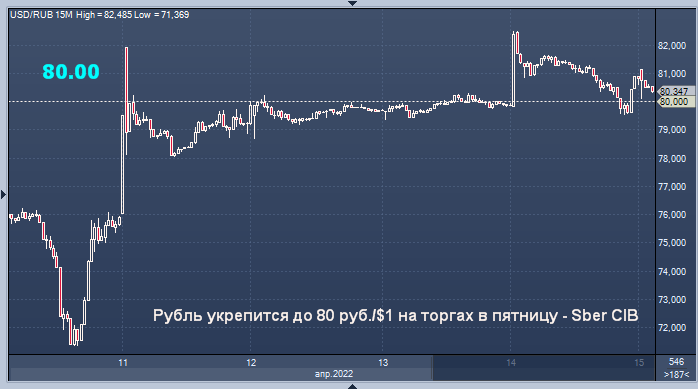Курс рубля к доллару США, вероятно, укрепится до уровня 80 руб./$1 на торгах в пятницу на фоне возможной поддержки со стороны экспортеров, считают экономисты Sber CIB.