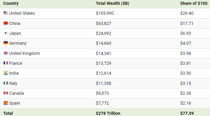 На первом месте США, на которые приходится 29,40 доллара, или почти треть всего богатства, а Китай занимает второе место: на его долю приходится 17,71 доллара.