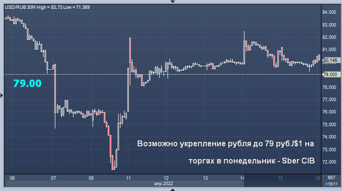 Возможно укрепление курса рубля к доллару США до уровня 79 руб./$1 на торгах в понедельник, так как в преддверии крупных налоговых выплат на следующей неделе экспортёры будут наращивать продажу валюты, написали утром аналитики Sber CIB.