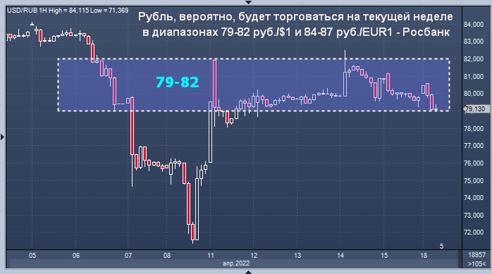"Баланс сил на валютном рынке на предстоящей неделе, на наш взгляд, останется смешанным. С одной стороны, интенсивные продажи экспортной выручки сохранятся в контексте благоприятной сезонности внешнеторгового оборота в апреле, а с другой - наблюдается негатив ввиду динамики процентных ставок и валют развитых стран на внешних рынках, а также отсутствия подвижек в геополитических процессах. В этом контексте мы предполагаем, что диапазоны колебаний пар доллар/рубль и евро/рубль могут расшириться до 79-82 руб./$1 и 84-87 руб./EUR1", - написали они в понедельник утром.