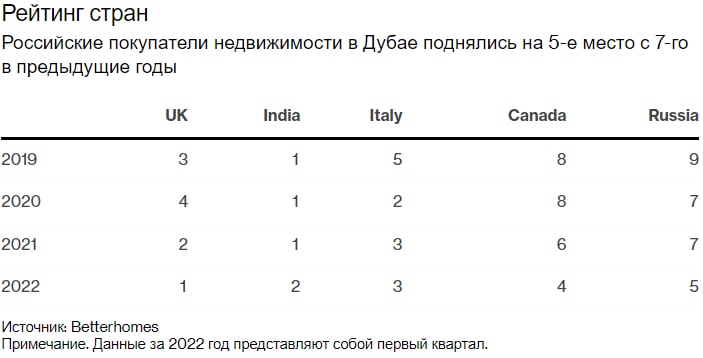 Рейтинг стран. Российские покупатели недвижимости в Дубае поднялись на 5-е место с 7-го в предыдущие годы Источник: Betterhomes. Примечание. Данные за 2022 год представляют собой первый квартал.