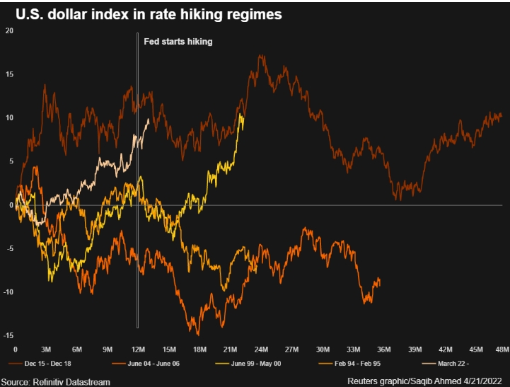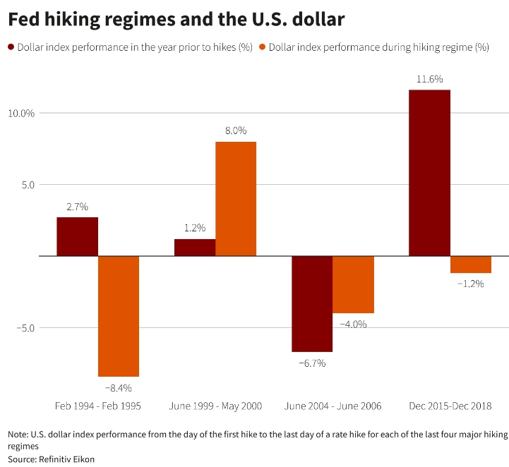 Однако в трех из последних четырех циклов роста индекс доллара продолжал сокращать часть своей прибыли, потеряв в среднем 1,4% между первым и последним повышением ставки, согласно анализу данных Refinitiv, проведенному Reuters.