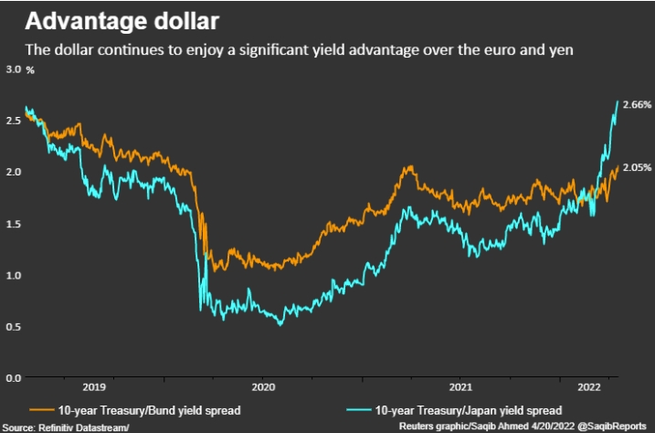 Доллар по-прежнему имеет значительное преимущество в доходности по сравнению с евро и иеной. График Reuters