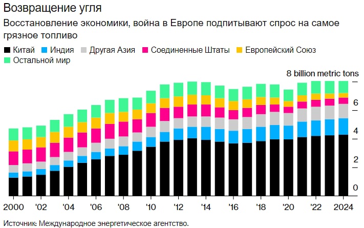 Возвращение угля. Восстановление экономики, военный конфликт в Европе подпитывают спрос на самое грязное топливо. Источник: Международное энергетическое агентство.