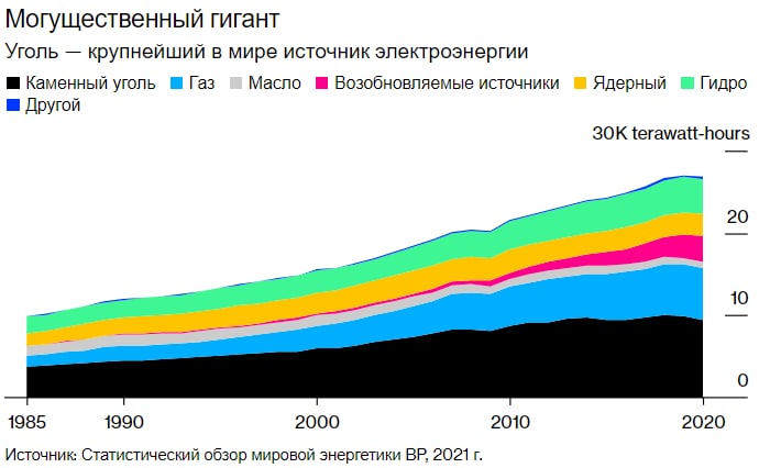 Могущественный гигант. Уголь — крупнейший в мире источник электроэнергии. Источник: Статистический обзор мировой энергетики BP, 2021 г.