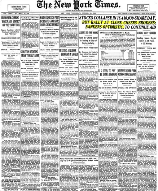 Во втором твите в понедельник Бьюрри вставил цифровую копию первой страницы The New York Times от 30 октября 1929 года и написал: «И это тоже». Он обратил внимание на резко позитивный заголовок о случившемся накануне крахе фондового рынка — катастрофическом событии, которое стало известно как «Черный вторник» и ускорило Великую депрессию.