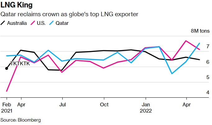 Согласно данным отслеживания судов, собранным Bloomberg, апрельский экспорт сверхохлажденного топлива из Катара превысил 7,5 млн метрических тонн, опередив США. Месяцем ранее техническое обслуживание в Qatargas сократило экспорт ближневосточной страны.