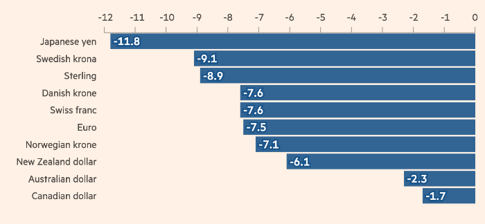 Доходность спот относительно доллара США (%) c начала года. Источник: The Financial Times