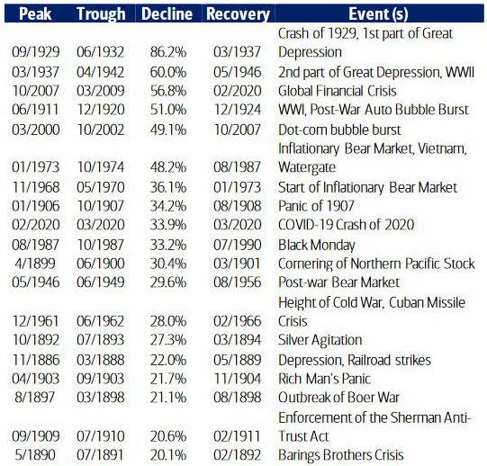 Список медвежьих циклов в США за последние 140 лет (столбцы слева направо): пик, дно, размер снижения, дата возвращения к предыдущим максимумам, причина снижения. Источник: Bank of America