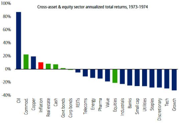 Эксперт полагает, что сегодняшняя ситуация больше всего похожа на период 1973/74 годов, когда в условиях стагфляции сырье и наличные показали заметно лучшую динамику, чем акции и облигации.