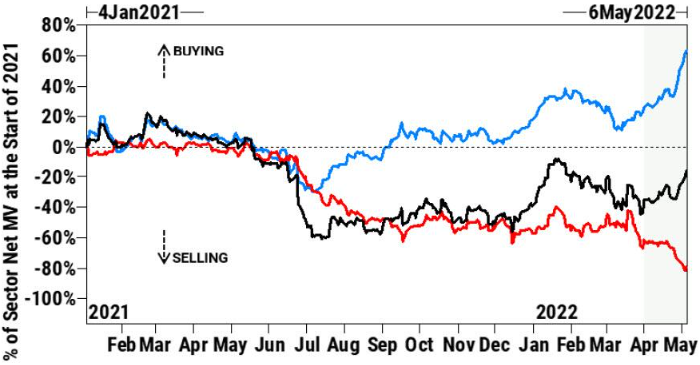 В частности, объем покупок этих бумаг хедж-фондами достиг максимального значения с 20 марта на фоне сильной динамики цен на нефть. По данным GS Prime, отношение покупок к коротким продажам составило здесь 4:1.