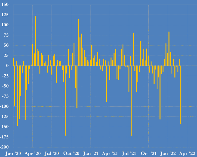 В течение двух недель после 24 февраля, когда Россия начала специальную военную операцию на территории Украины, нефть WTI взлетела с $95 за баррель в область $130 за баррель. На неделе до 8 марта, когда и были достигнуты эти 14-лентие максимумы, крупные спекулянты, такие как хедж-фонды, продали фьючерсов и опционов в шести самых активных контрактах на WTI, бензин, дизель и газойль на 142 млн баррелей, что было близко к рекордным за всю историю значениям.