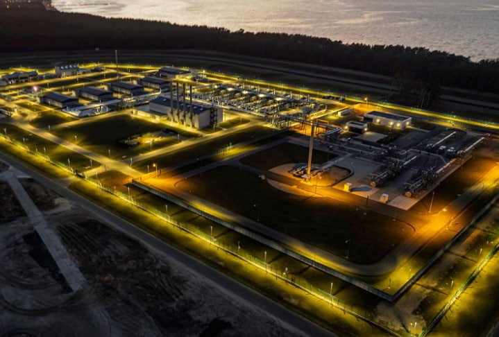 Трубы на береговых сооружениях газопровода "Северный поток-2" из России изображены в Любмине, Германия, 7 марта 2022 года. REUTERS/Ганнибал Ханшке