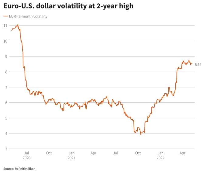 Трехмесячная волатильность евро и иены по отношению к доллару достигла самого высокого уровня с июня 2020 года. График агентства Рейтер