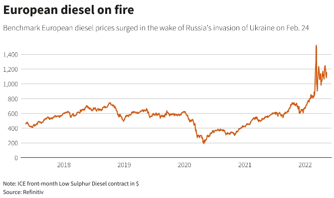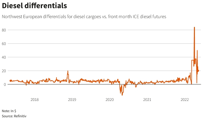 Маржа переработки сырой нефти в дизельное топливо в Европе в начале этого года подскочила до рекордного уровня около 90 долларов за баррель и в настоящее время составляет 50 долларов за баррель, поскольку трейдеры избегают российского дизельного топлива, от которого Европа сильно зависит.