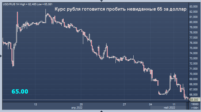 В 14.30 по Москве рубль вырос более чем на 2% до 65,48 по отношению к доллару после кратковременного касания 65,0625, уровня, который в последний раз наблюдался в конце февраля 2020 года.