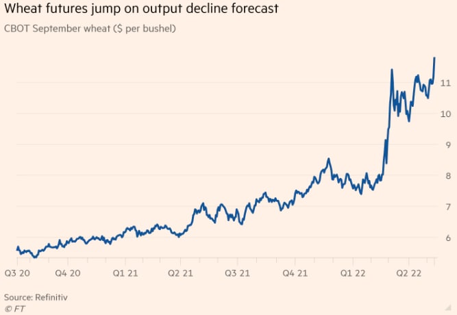 Фьючерсы на пшеницу в Чикаго с поставкой в сентябре подскочили почти на 6% до 11,82 доллара за бушель после того, как Министерство сельского хозяйства США опубликовало свои первые мировые оценки на урожай 2022-23 годов.