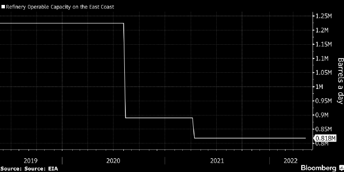 Мощности НПЗ на Восточном побережье США в млн баррелей в день. Данные: Минэнерго США, источник: Bloomberg