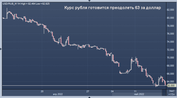 В 11:47 по Москве рубль укрепился на 2,26% по отношению к доллару до 63,05, достигнув самой высокой отметки с начала февраля 2020 года в 62,6250 в пятницу.