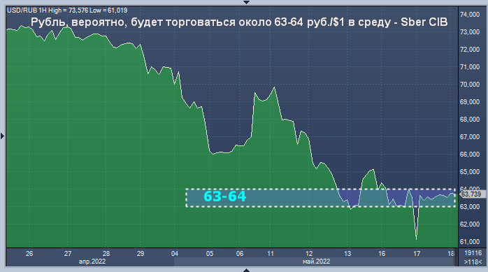 "Рубль во вторник торговался в диапазоне 63-64 руб./$1. По нашему мнению, вблизи этих уровней спрос и предложение валюты сбалансированы, и рубль останется около них и в среду. Но к концу текущей недели или в начале следующей ожидаем укрепления рубля до 60 руб./$1. Экспортерам предстоит продать валюту для уплаты 25 мая налога на добычу полезных ископаемых в размере 600 млрд руб." - пишут аналитики утром в среду.