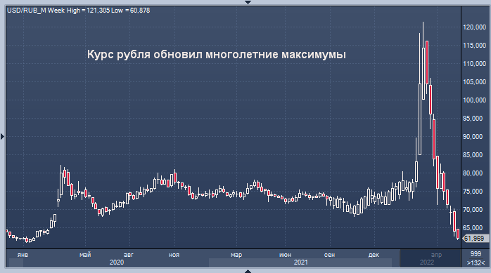 В 11:53 по Москве рубль вырос на 2,8% до 61,73 за доллар на Московской бирже, приблизившись к уровням, ранее наблюдавшимся в начале 2020 года.