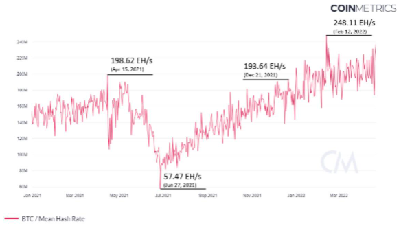 Однако китайские майнеры ответили на этот запрет уходом в подполье и быстрым переносом оборудования подальше от глаз властей, в том числе за границу. К декабрю 2021 года глобальная скорость хеширования вернулась к прежнему уровню, достигнув 21 декабря 2021 года 193,64 EH/s. К февралю 2022 года был достигнут новый исторический максимум в 248,11 EH/s глобальной скорости хеширования биткойнов, что демонстрирует невероятную адаптивность экосистемы этой криптовалюты перед лицом невзгод.
