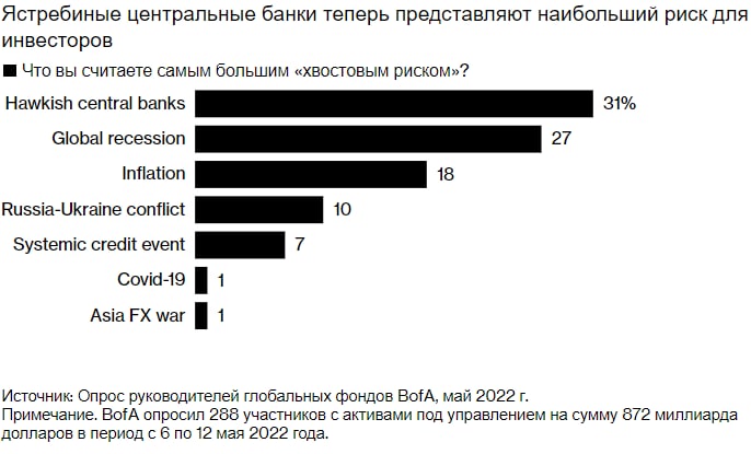 Ястребиные центральные банки теперь представляют наибольший риск для инвесторов. Источник: опрос руководителей глобальных фондов BofA, май 2022 г. Примечание. BofA опросил 288 участников с активами под управлением на сумму 872 миллиарда долларов в период с 6 по 12 мая 2022 года.