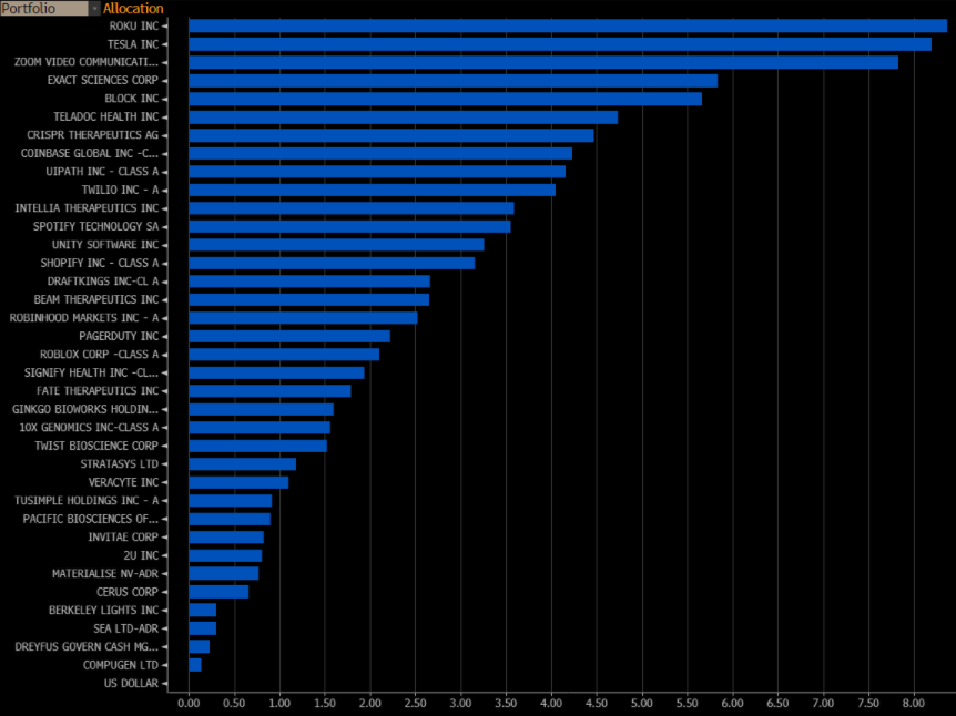 Процентный вес различных бумаг в портфеле ARK Innovation ETF. Данные: Bloomberg