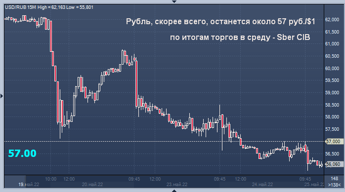 Курс рубля, скорее всего, останется около уровня 57 руб./$1 по итогам торгов в среду, считают аналитики Sber CIB.
