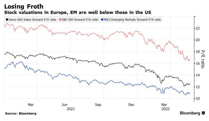 Фондовый рынок США вызывал больше беспокойства в контрольном списке Citi во время пика прошлогоднего глобального ралли акций по сравнению с Европой и развивающимися рынками, что заставляет стратегов отдавать предпочтение последним из-за более низких оценок. S&P 500 и Stoxx 600 в этом году упали примерно на 16% каждый в долларовом выражении, а индекс MSCI EM упал на 17%.