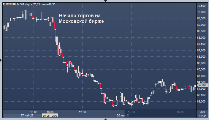 Таким образом, по официальному курсу ЦБ доллар снизился к рублю на 3 рубля 31 копейку (-6,67%), а евро — на 4 рубля 72 копейки (-7,73%). Объем торгов на Московской бирже к 19:00 мск понедельника составил 634,19 млрд рублей или 9,55 млрд долларов.