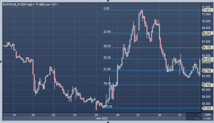 В начале торговой сессии среды рубль заметно дешевел против доллара и евро. Пока глубина коррекции в этих валютах ограничивается областью 61,8% от роста, который имел место во второй половине прошлой недели.