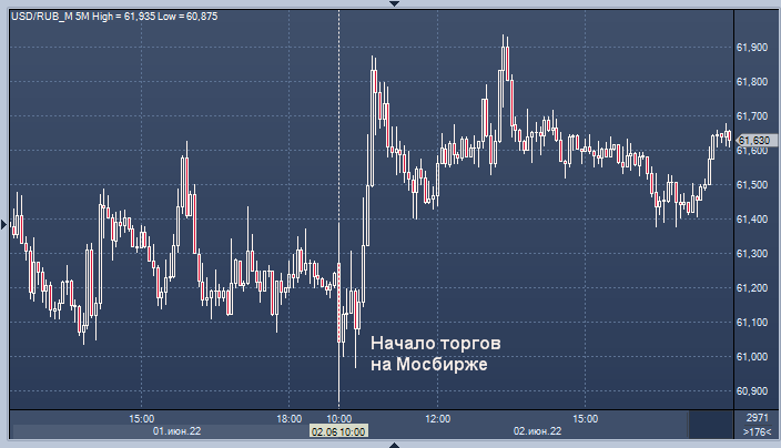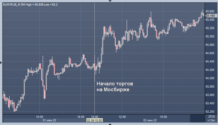 Второй день подряд колебания валютных курсов носят незначительный по нынешним меркам характер. Из событий четверга стоит отметить лишь дальнейшее сокращение спреда между курсом евро к доллару на Мосбирже и на внешних площадках до 75 пипсов, тогда как во вторник, 31 мая, этот разрыв превышал шесть фигур. Его сегодняшнее сокращение было обусловлено опережающим ростом евро/рубля относительно доллар/рубля.