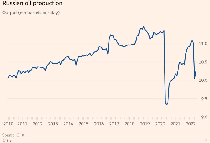 Антон Силуанов, министр финансов России, предупредил в апреле, что добыча нефти в России может упасть на 17% в этом году, что означает падение примерно на 2 млн баррелей в сутки. С тех пор вице-премьер Александр Новак представил более оптимистичный прогноз, сообщив российским СМИ, что добыча увеличилась в мае на 200–300 000 баррелей в сутки и что он ожидает дальнейшего восстановления в июне.