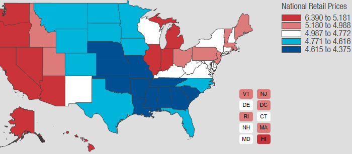 Стоимость галлона бензина на заправках разных штатов США. Источник: ААА