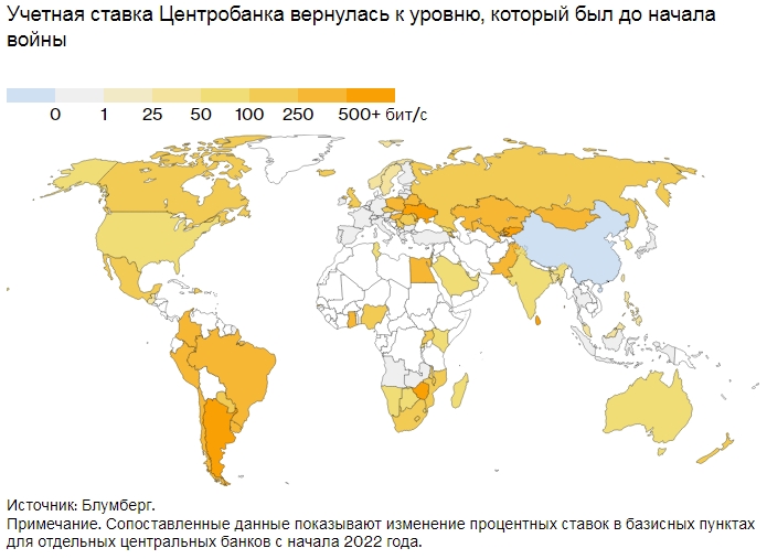 Возврат ставки. Учетная ставка Центробанка вернулась к уровню, который был до начала СВО. Источник: Блумберг. Примечание. Сопоставленные данные показывают изменение процентных ставок в базисных пунктах для отдельных центральных банков с начала 2022 года.