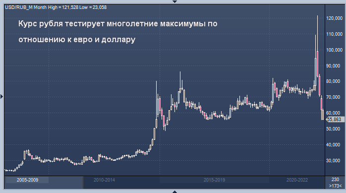 По отношению к доллару рубль только что протестировал уровни в районе ниже 55,80, немного не установив новые многолетние максимумы, чему способствовал контроль за движением капитала, который Россия ввела в конце февраля после отправки десятков тысяч военнослужащих на Украину.