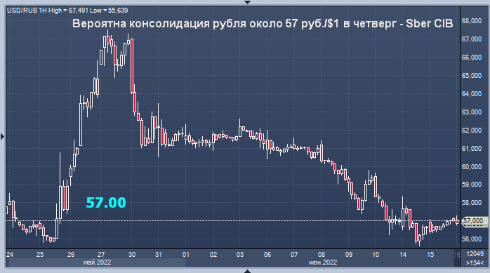 Вероятна консолидация курса рубля около уровня в 57 руб./$1 на торгах в четверг, считают эксперты Sber CIB.