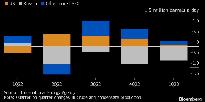 Рост добычи должен восстановиться в третьем квартале, при этом ожидается увеличение производства в Казахстане, продолжение роста в США и лишь небольшое падение производства в России. Но все изменится в четвертом квартале, когда ожидается резкое падение добычи в России, вызванное санкциями со стороны ЕС в отношении ее морского экспорта нефти, которые должны вступить в силу в декабре. По прогнозам, падение добычи нефти в России перевесит замедлившийся, но все же положительный рост добычи в остальных странах мира, не входящих в ОПЕК.