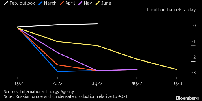 Первоначально (в марте) МЭА ожидало сокращения добычи нефти в России по итогам 2022 года примерно на 3 миллиона баррелей в день, однако теперь прогнозирует, что этот показатель опустится до 9,38 млн баррелей в день к четвертому кварталу и еще больше снизится в начале 2023 года.