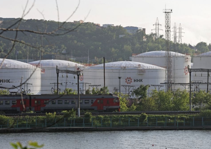 Поезд движется мимо нефтяных цистерн нефтебазы "ННК-Приморнефтепродукт" в дальневосточном порту Владивосток, Россия, 11 июня 2022 года. REUTERS/Татьяна Меель