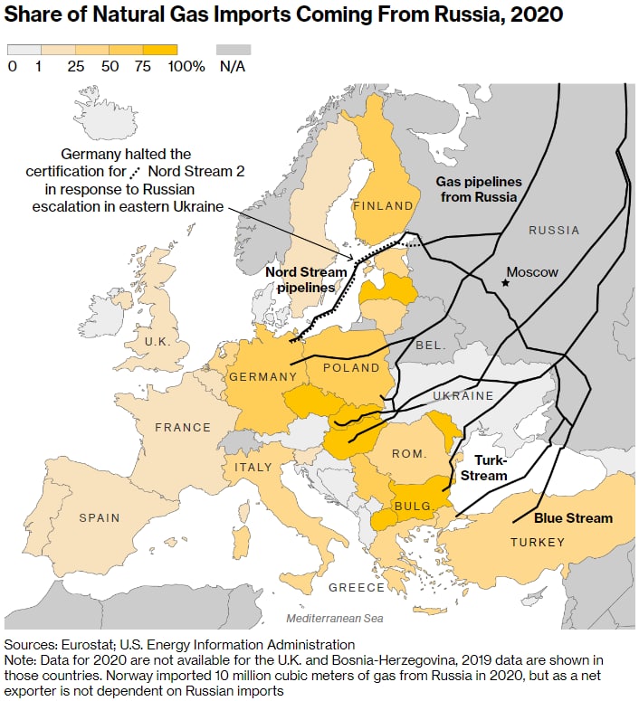 Доля импорта природного газа из России, 2020 г. Источники: Евростат; Управление энергетической информации США. Примечание. Данные за 2020 г. недоступны для Великобритании и Боснии и Герцеговины, для этих стран показаны данные за 2019 г. Норвегия импортировала 10 млн кубометров газа из России в 2020 году, но как нетто-экспортер не зависит от российского импорта