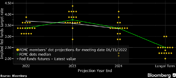 В среду, 15 июня, ФРС впервые с 1994 года повысила ставку по федеральным фондам сразу на 0,75%, а медианные прогнозы членов FOMC по ее уровню на конец 2022 и 2023 годов выросли до 3,4% и 3,8% соответственно.