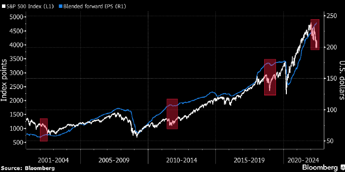 Кроме того, на рынке акций США наблюдается необычное расхождение: S&P 500 быстро снижается, тогда как прогнозы аналитиков по прибыли американских компаний остаются позитивными.