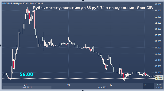 Аналитики Sebr CIB продолжают ожидать дальнейшего укрепления рубля к доллару США до уровня 56 руб./$1; это может случиться уже в понедельник, так как по мере приближения крупных налоговых выплат экспортеры повысят свою активность. Это, к слову, уже происходит: после слабого открытия рубль заметно прибавил к 11 утра в Москве - 56,51 к доллару.