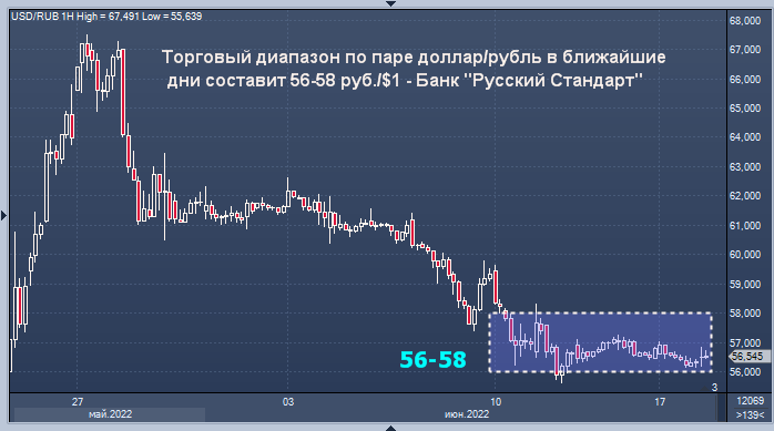 Директор департамента операций на финансовых рынках банка "Русский Стандарт" Максима Тимошенко немного сузил прогнозный диапазон колебания рубля против доллара и евро на ближайшие дни до 56-58 руб./$1 и 58-60 руб./EUR1 соответственно.