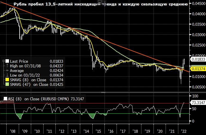 Так что же теперь говорят графики? Нижеприведенный месячный график от максимума 2008 года показывает резкое преодоление рублем 13,5-летнего нисходящего тренда и каждую скользящую среднюю в ее начальном спринте.