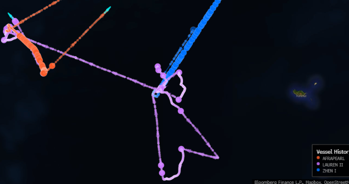 Предположительная перевалка грузов с участием трех судов c идентификаторами AFRAPEARL (оранжевым), LAUREN II (фиолетовым) и ZHEN I (голубым) между Мадейрой и Азорскими островами в мае—июне 2022 года. Источник: Bloomberg