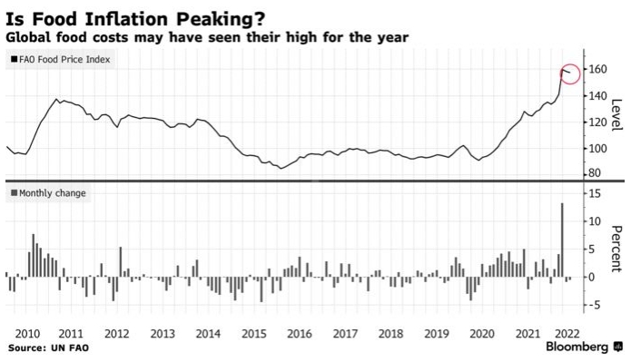 Глобальные запасы в предстоящем сезоне останутся низкими, а миллионы тонн зерна застряли в Украине, но здесь ситуация может стабилизироваться. Некоторые украинские грузы достигают Европы, в то время как Россия прогнозирует небывалый урожаю. Пальмовое масло, наиболее потребляемое пищевое масло в мире, только что упало до самого низкого уровня в этом году, поскольку крупнейший производитель Индонезия наращивает экспорт, в то время как пшеница, кукуруза и соевые бобы упали с максимумов. Мировые цены на продовольствие уже упали с рекордно высокого уровня в марте, и за этим может последовать дальнейшее снижение.